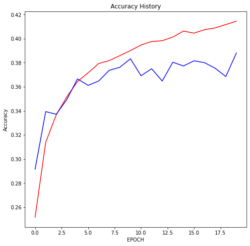 트레이닝, 테스트 모두 에포크가 지남에 따라 서서히 증가. 하지만 그 수치가 50% 미만.