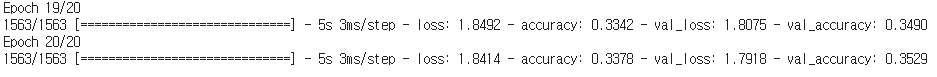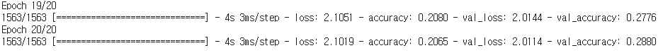 나의 경우에도 비슷한 양상을 보인다 Loss의 경우도 1.6이 넘는 수치. Accuracy도 50% 미만.