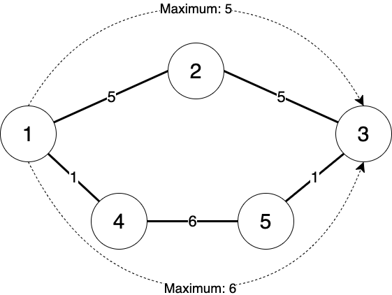 예를 들어, 위의 그림과 같이 5개의 교차로와 5개의 골목이 있으며, 당신이 1번 교차로에서 3번 교차로로 가고 싶은 상황이라고 하자. 만약 10원을 들고 출발한다면 2가지 경로로 갈 수 있다. 1번 -> 2번 -> 3번 교차로로 이동하게 되면 총 10원이 필요하고 이 과정에서 최대 수금액을 5원이었고, 1번 -> 4번 -> 5번 -> 3번 교차로로 이동하게 되면 총 8원이 필요하며 최대 수금액은 6원이 된다. 최소한의 수치심을 얻는 경로는 최대 수금액이 5인 경로이다. 하지만 만약 8원밖에 없다면, 전자의 경로는 갈 수 없기 때문에 최대 수금액이 6원인 경로로 가야 하는 것이 최선이다.