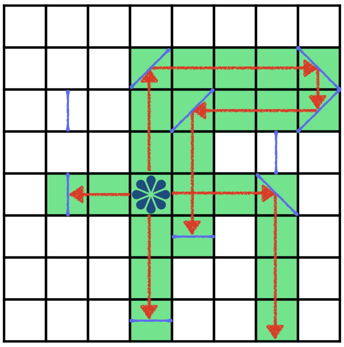 그리고 물건을 만났을 때 방향만 전환해주면서 dfs 방식으로 탐색하였다. dfs 에는 위치와 방향을 넣었다.