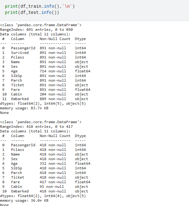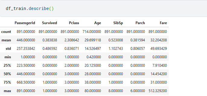 DataSet을 확인할 때는 describe, info를 주로 사용하고 describe의 파라미터로 include="all" 을 사용하여 전체를 다 볼 수 있다. 없다면 숫자와 관련된 feature만 나온다.