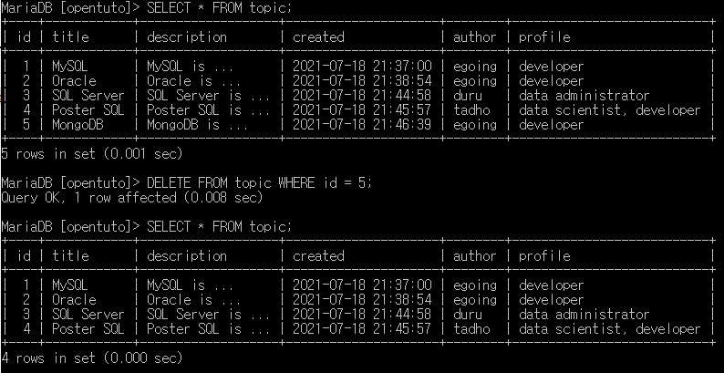 # DELETE도 마찬가지로 WHERE을 안 붙이면 전체가 삭제된다.(주의)
