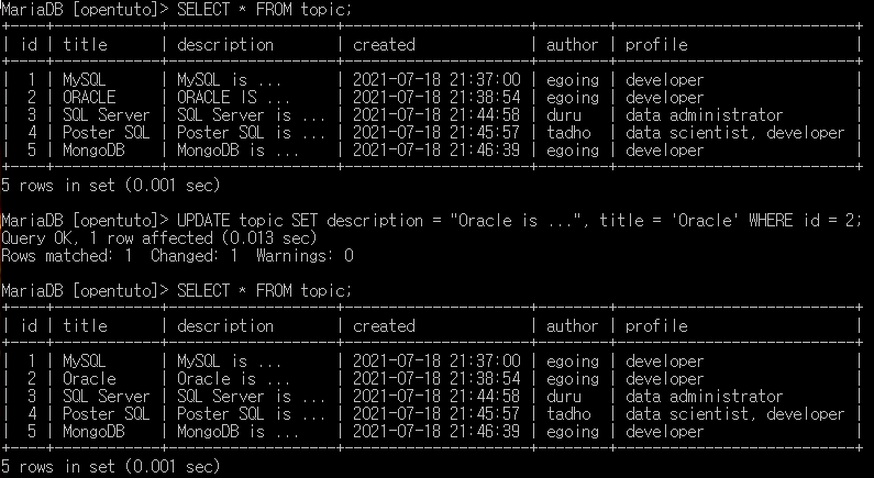 UPDATE topic SET description = "Oracle is ...", title = 'Oracle' WHERE id = 2;