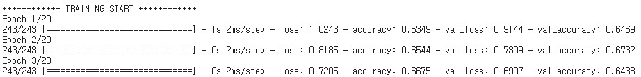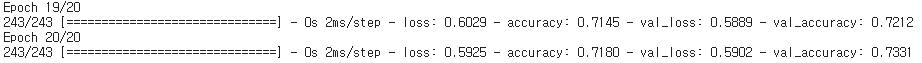 성능 확인 시, val_accuracy를 확인 -> 현재 73%확률로 인공지능이 성별, 키, 체중을 보고 초,중,고등학생을 구분
