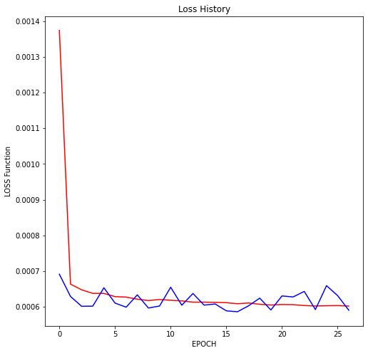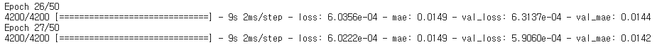 이 경우, 27에포크에서 멈춤. mae 기준 1.42% 정도의 성능을 보임.