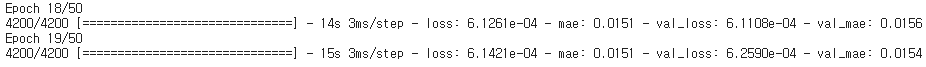 나의 경우 19에포크에서 학습이 멈춤 -> 학습 최종 성능은 MAE 기준 1.54% 오차 기준