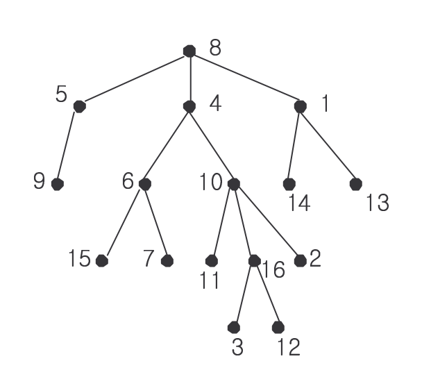 그리고 그 다음 N-1개의 줄에 트리를 구성하는 간선 정보가 주어집니다. 한 간선 당 한 줄에 두 개의 숫자 A B 가 순서대로 주어지는데, 이는 A가 B의 부모라는 뜻입니다. (당연히 정점이 N개인 트리는 항상 N-1개의 간선으로 이루어집니다!) A와 B는 1 이상 N 이하의 정수로 이름 붙여집니다.